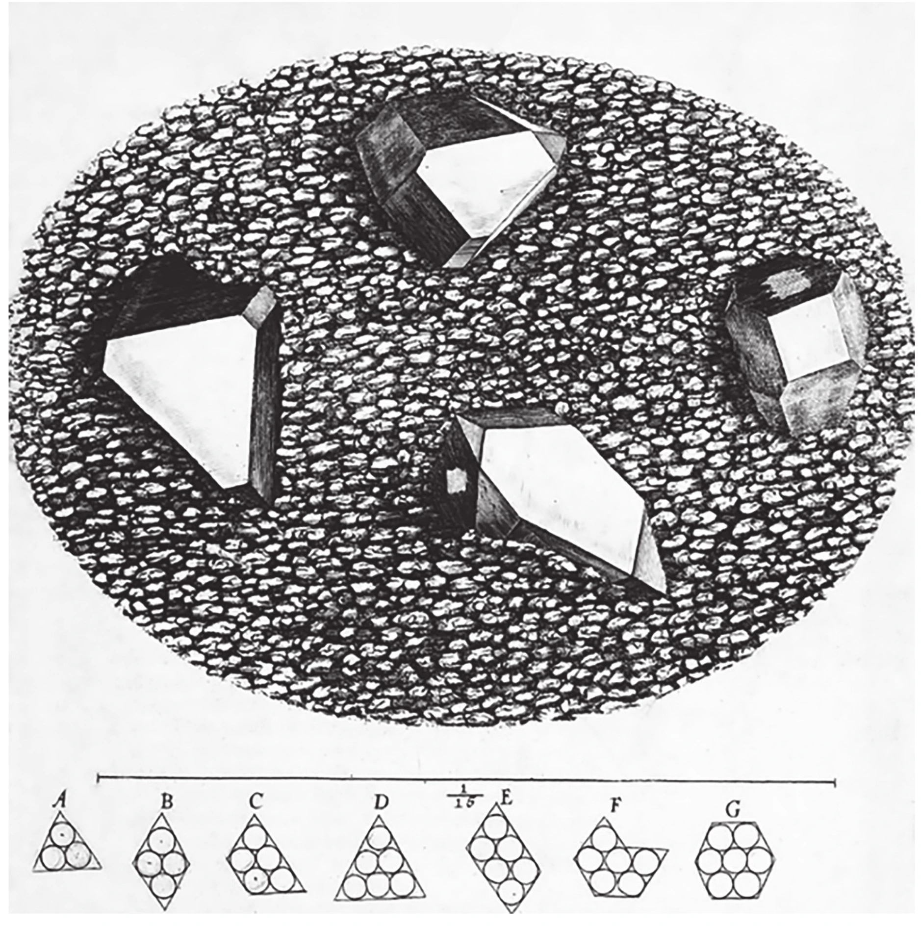These observations were taken up in detail by Christiaan Huygens (1629–1695). Best known as an astronomer who discovered Titan and unraveled the nature of Saturn’s rings, Huygens also made foundational contributions to optics in his wave theory of light, described in Traité de la Lumière, principles that would later shape the mineral sciences (Fig. 1). Newton (1643–1727) laid the foundations for an experimental and predictive science, and the study of crystal properties played a decisive role in the progress of optics. Crystals are also solids that can be recognized by their characteristic shapes. Niels Stensen (Nicolas Steno in Latin: 1638–1686) was the first to recognize the constancy of their shapes, noticing that the angles of a hexagonal crystal did not vary, even though its sides could vary. Beautifully rendered by Robert Hooke (1635–1703), the external shapes were suggested to reflect an underlying coherency in their internal structure (Fig. 2). In the 1700s (Edo period), Japanese mineralogists and naturalists Gennai Hiraga (平賀源内) and Sekitei Kinouchi (木内石亭) were studying the science of minerals. Sekitei Kinouchi is particularly known as Japan’s first systematic mineralogist, focusing on crystal shapes and cleavage.