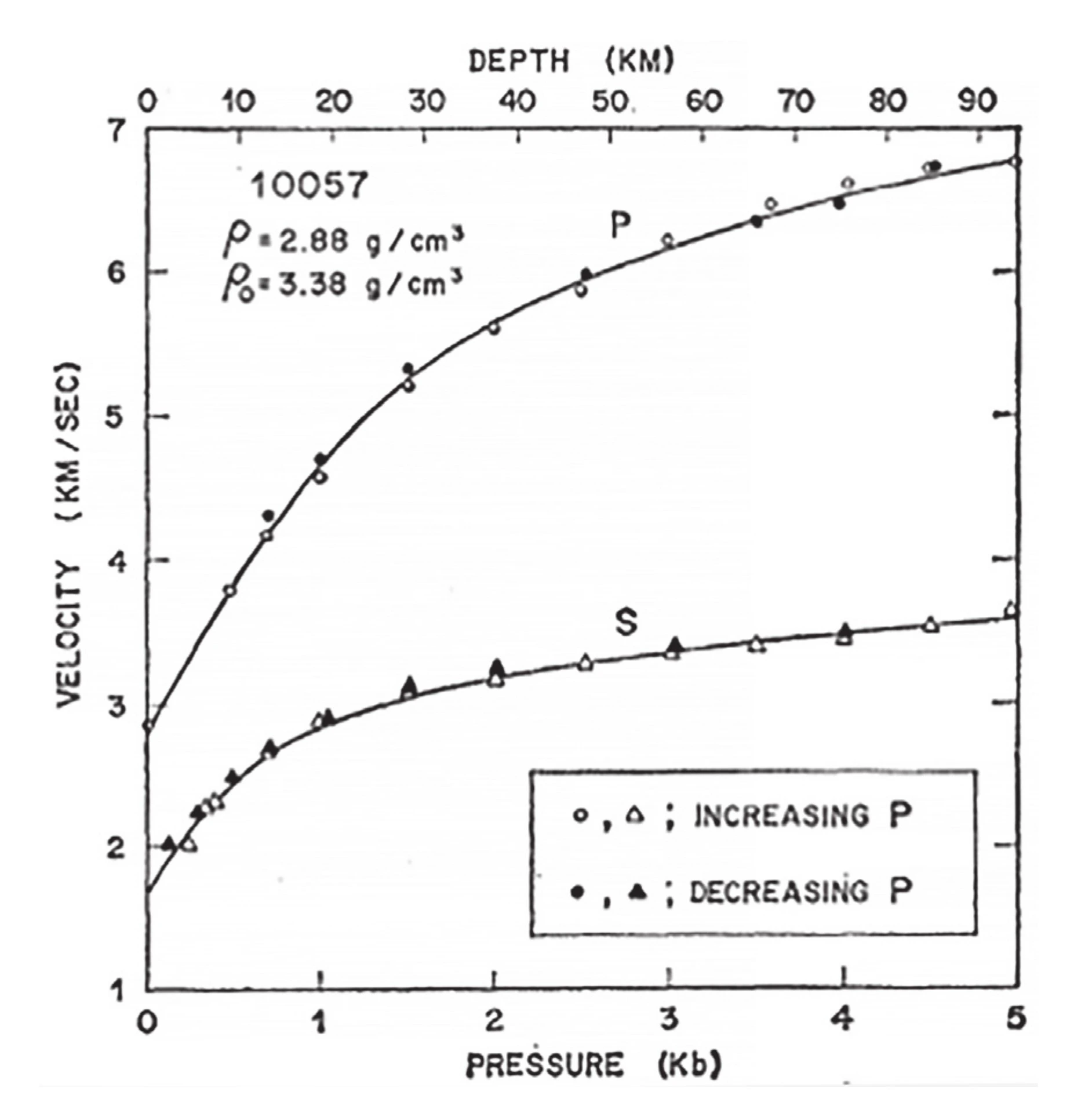 Kanamori HL, Nur A, Chung D, Wones D, Simmons G (1970) Elastic wave velocities of lunar samples at high pressures and their geophysical implications. Science 167: 726-728, doi: 10.1126/science.167.3918.726