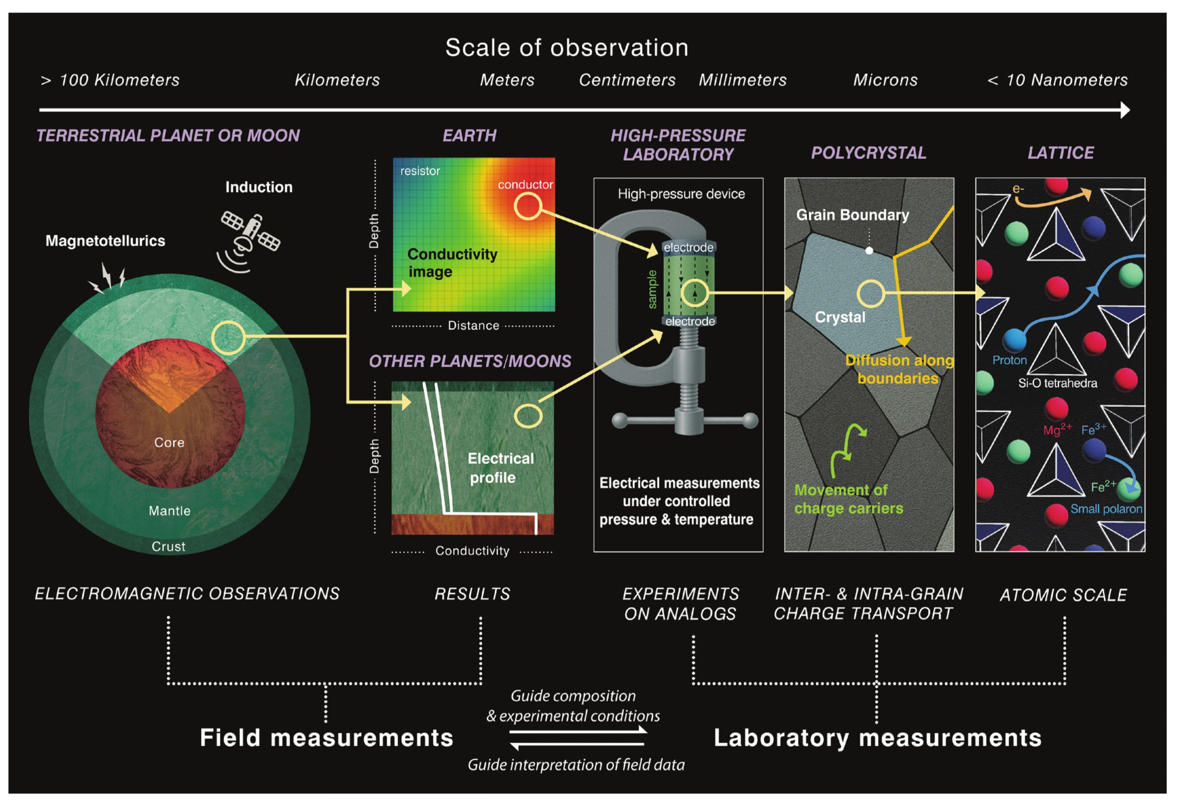 Elucidating the structure, composition, and thermal state of terrestrial bodies*, i.e., celestial bodies characterized by a rocky crust and mantle and a metallic core, is fundamental to understanding their origin and evolution. Among the different tools available to study terrestrial bodies, electromagnetic techniques that provide access to the interior are particularly powerful. The electrical properties of minerals and rocks that comprise the crust and mantle of the terrestrial planets (Mercury, Venus, Earth, Mars) and moons (e.g., the Moon, Europa, Ganymede, Io) in the Solar System are probed both in the field and in the laboratory. The knowledge derived from widely differing scales of observation (primarily from nanometer to millimeter in the laboratory, and from meters to hundreds of kilometers in the field) can be integrated for an in-depth understanding of the structure and composition of planetary interiors (Fig. 1).