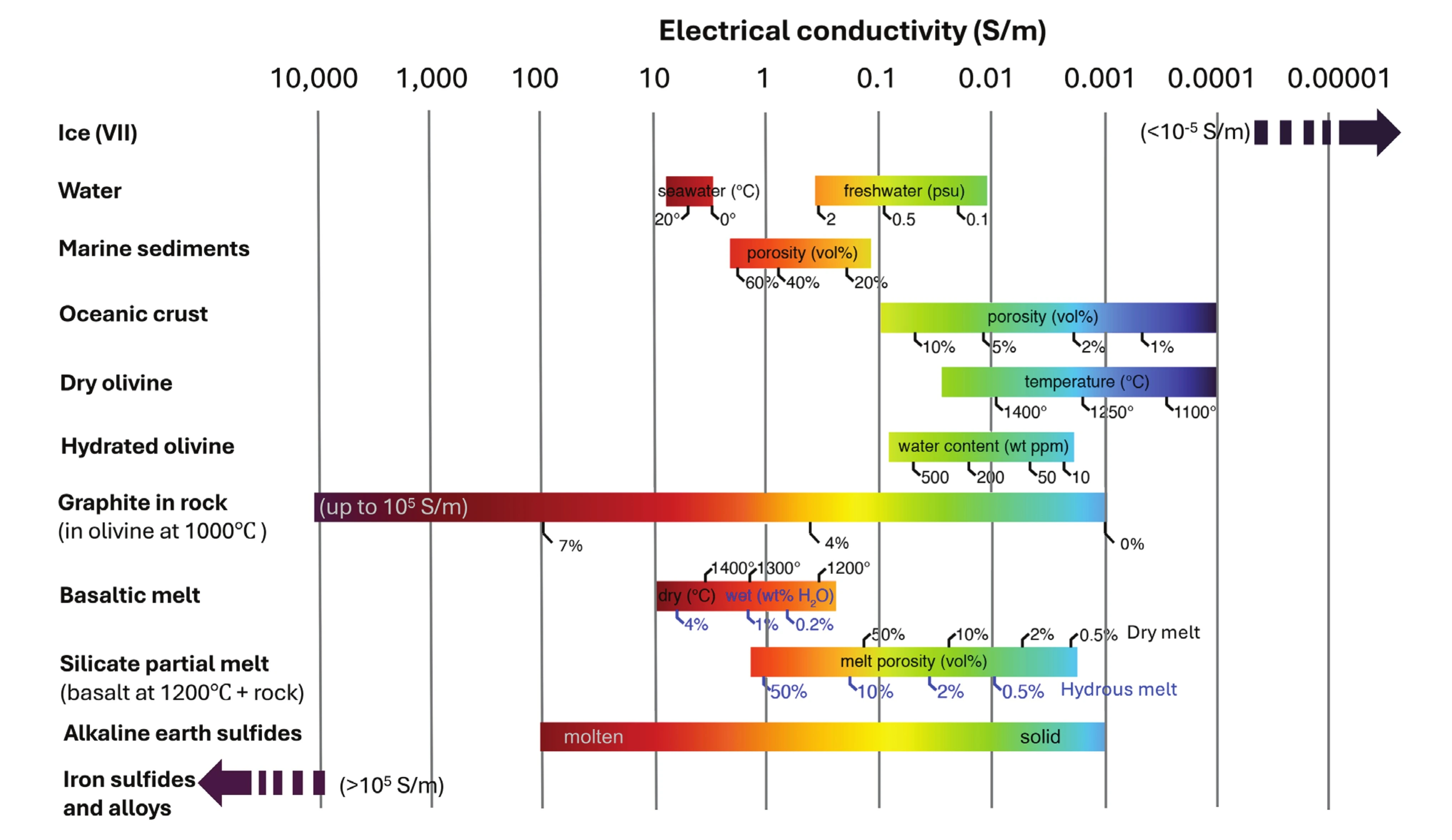 The electrical response of minerals and rocks is sensitive to chemistry, temperature, pressure (depth), redox conditions (i.e., chemical reaction between an oxidizing substance and a reducing substance), and texture (e.g., grain size) (Yoshino et al. 2024). In terrestrial bodies, most minerals are dielectrics in the crust, semiconductors in the mantle, while the metallic core is a conductor.