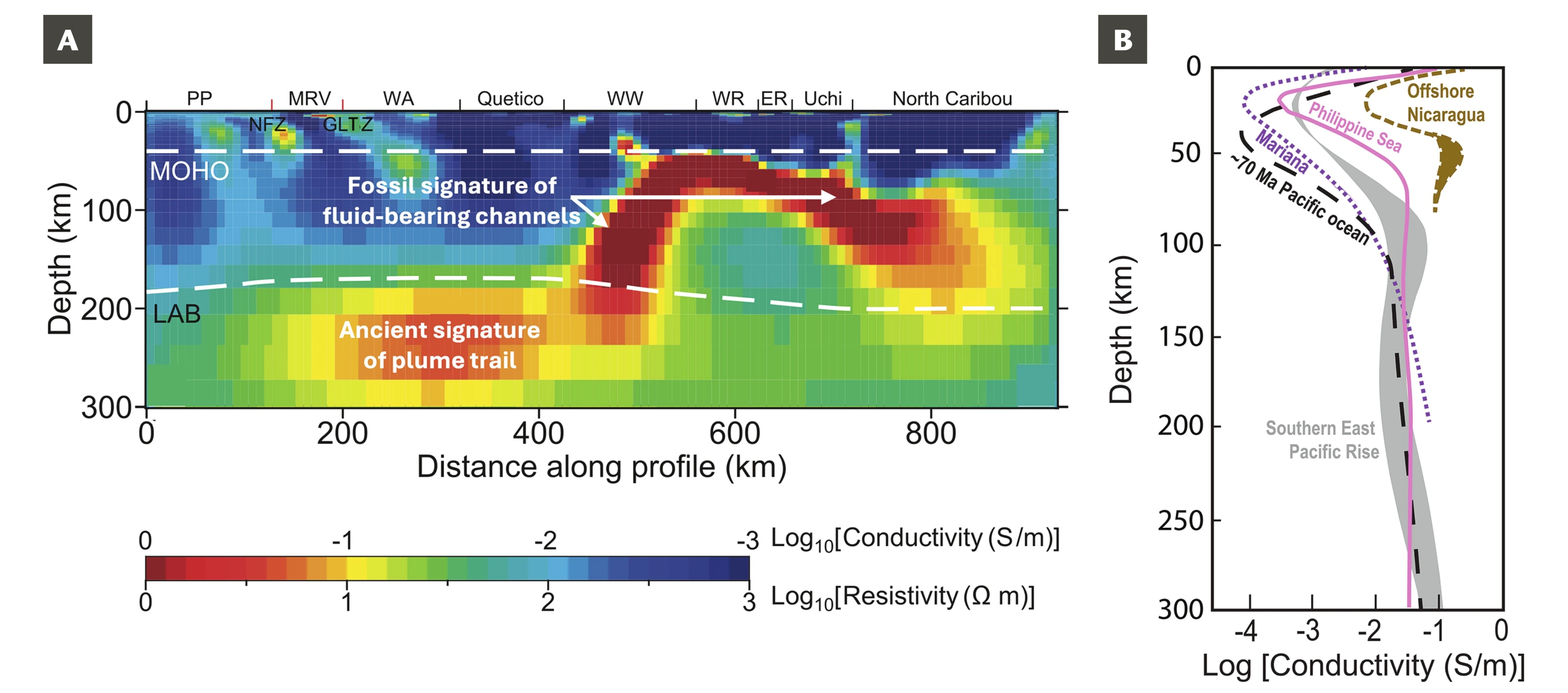 Electromagnetic studies of subduction zones, mid-ocean ridges, or cratons provide a snapshot of the presentday structure and thermal state of the Earth. The variations in conductivity revealed in these studies have been key to understanding geological, geothermal, and tectonic processes. As an example, our understanding of the structure and rheology of the Tibetan Plateau has strongly benefited from MT studies that have revealed a highly conductive lower crust (e.g., Le Pape et al. 2012), with localized electrically conductive anomalies with values ranging from 0.1 to 1 S/m. Based on electrical laboratory measurements, these values are best reproduced with the presence of aqueous fluids and/or partial melting, and partial melting is consistent with the significant heat flow in this region. Another example is the recent investigation of the North American Midcontinent Rift using EarthScope USArray and Lithoprobe magnetotelluric data (Lin et al. 2024; Fig. 3A). The 3-D inversion of the data revealed multiple conductors in the crust and uppermost mantle, including a highly conductive linear anomaly extending for over 300 km within the Superior Craton lithospheric mantle. Highlighting the ambiguities in interpreting conductive bodies at depth, this feature was interpreted by Lin et al. (2024) as the signature of a former plume tail but has been reinterpreted by Roots et al. (2025) as an artifact caused by large-scale anisotropy.