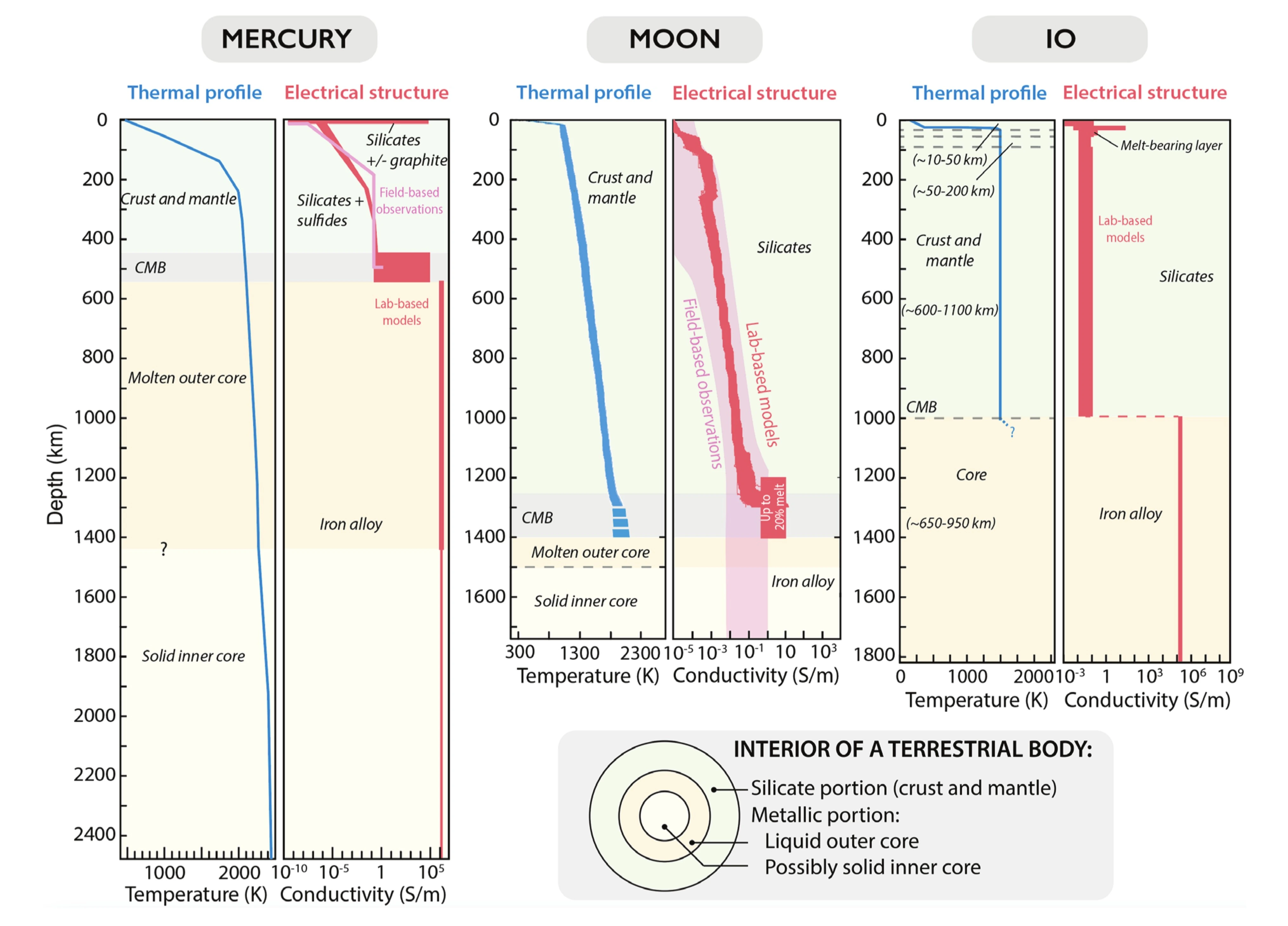 Defining the electrical structure of Jupiter’s moon Io is important to understand the distribution and amount of magma at depth, the present-day thermal state, and inform about cooling processes. Io is a highly active volcanic world, with several peculiarities concerning its interior, surface, atmosphere, and relationship to other bodies within the Jupiter system (Pommier and McEwen 2022). Assuming a partially molten silicate mantle hosting a sheared, melt-bearing shallow layer, and a metallic core, a preliminary conductivity profile of the interior can be calculated. New observations as part of future missions are needed to compare this profile with field electromagnetic measurements. On Ganymede, in situ measurements from the past Galileo mission and ongoing measurements from the Juno mission point to the presence of a global liquid water ocean underneath a thick icy crust (Kivelson et al. 2002).